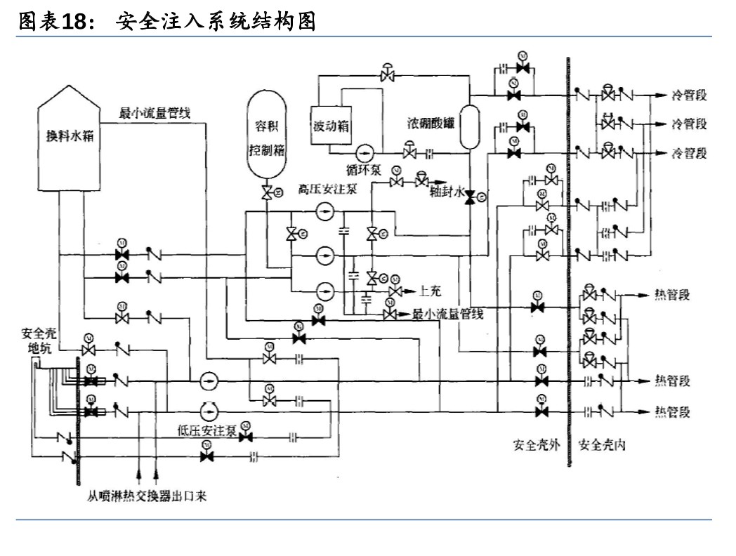 1) 安全注入系統(tǒng):又稱緊急堆芯冷卻系統(tǒng),當(dāng)一回路系統(tǒng)發(fā)生破口失水事故時,將硼酸溶液注入堆芯;當(dāng)二回路主蒸汽管道破裂時,向一回路注入高濃度硼酸溶液。典型的安全注入系統(tǒng)包括高壓安全注入、中壓安全注入和低壓安全注入三個子系統(tǒng),分別對應(yīng)不同的一回路壓力。