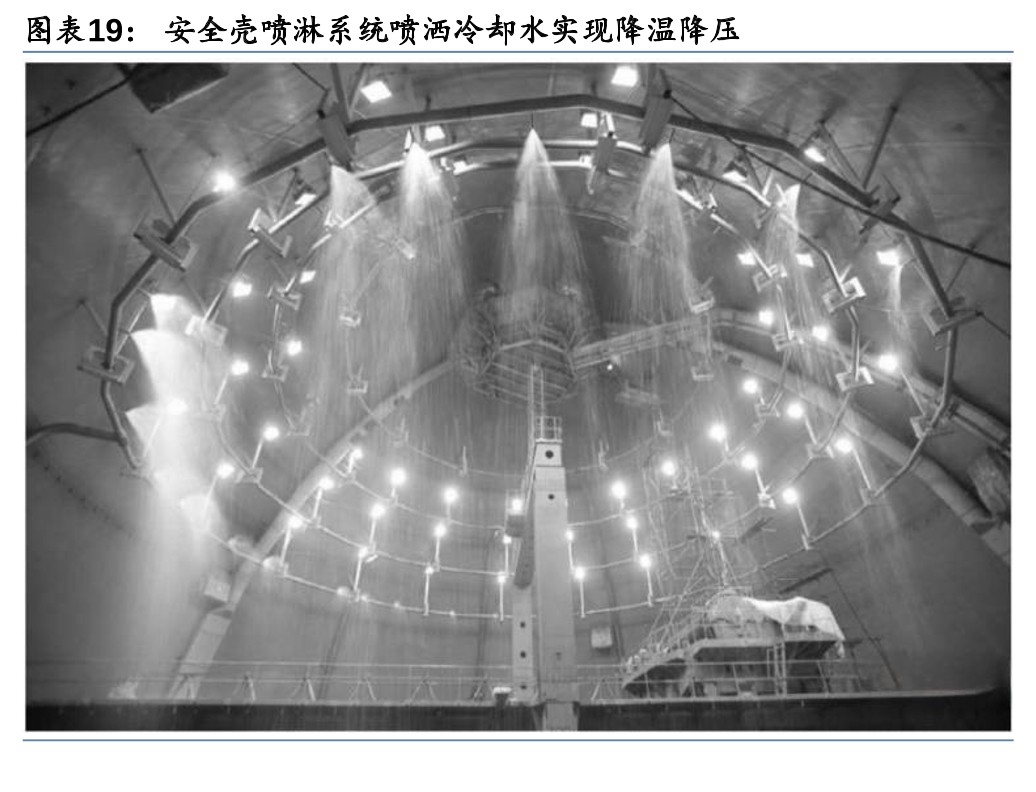 3) 安全殼噴淋系統(tǒng):在發(fā)生失水事故或?qū)е掳踩珰?nèi)溫度、壓力升高的主蒸汽管道破裂事故時從安全殼頂部空間噴灑冷卻水,為安全殼氣空間降溫降壓,限制事故后安全殼內(nèi)的峰值壓力,以保證安全殼的完整性。