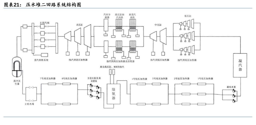 壓水堆二回路系統(tǒng)由汽輪機發(fā)電機組、凝汽器、凝結(jié)水泵、給水加熱器、除氧器、給水泵、蒸汽發(fā)生器、汽水分離再熱器等設(shè)備組成。蒸汽發(fā)生器的給水在蒸汽發(fā)生器吸收熱量變成高壓蒸汽,然后驅(qū)動汽輪發(fā)電機組發(fā)電,做功后的乏汽在凝汽器內(nèi)冷凝成水,凝結(jié)水由凝結(jié)水泵輸送,經(jīng)低壓加熱器進入除氧器,除氧水由給水泵送入高壓加熱器加熱后重新返回蒸汽發(fā)生器,形成熱力循環(huán)。