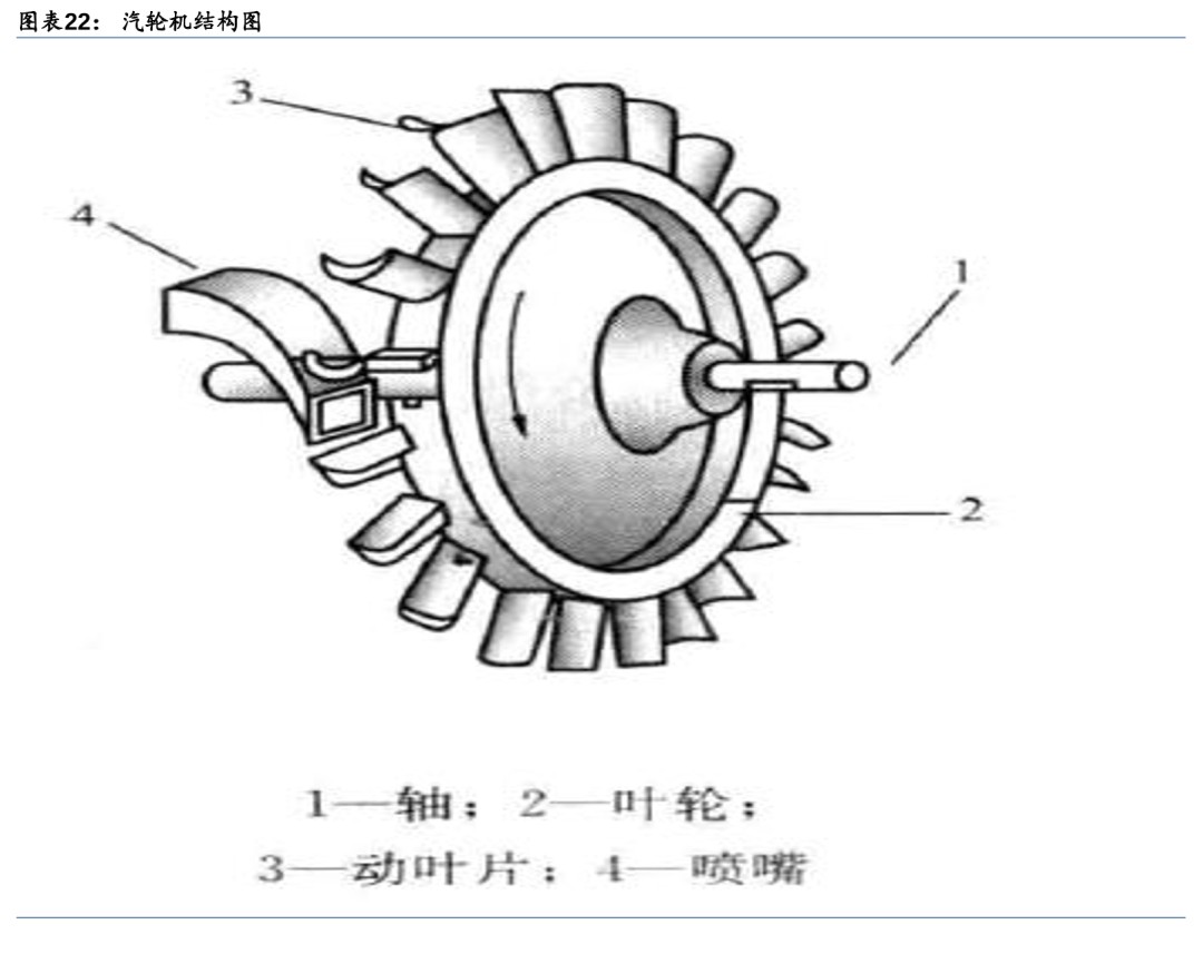 1) 汽輪機(將熱能轉(zhuǎn)化為機械能):將高溫高壓蒸汽的熱能轉(zhuǎn)化為機械能。在汽輪機中,蒸汽在噴嘴中發(fā)生膨脹,壓力降低,速度增加,熱能轉(zhuǎn)變?yōu)閯幽堋8咚倨髁鹘?jīng)動葉片時,由于汽流方向改變,產(chǎn)生了對葉片的沖動力,推動葉輪旋轉(zhuǎn)做功,將蒸汽的動能變成軸旋轉(zhuǎn)的機械能。