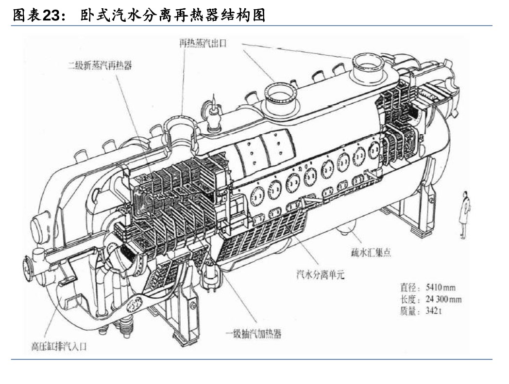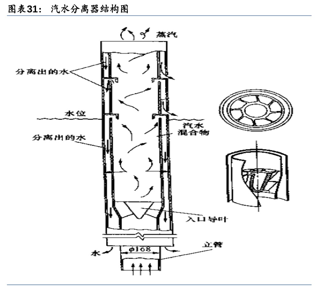 2) 汽水分離再加熱器(分離再加熱高壓缸蒸汽):蒸汽在汽輪機高壓缸內(nèi)膨脹做功后,從高壓缸排出的蒸汽濕度較高。若不采取任何措施,使該蒸汽流入低壓缸繼續(xù)做功,將導(dǎo)致汽輪機效率降低,甚至對汽輪機葉片產(chǎn)生沖蝕,導(dǎo)致汽輪機事故。汽水分離再加熱器用于將從汽輪機高壓缸出來的排汽經(jīng)汽水分離后再加熱,提高汽輪機效率。高壓缸排汽從汽水分離再熱器的殼側(cè)流進,先經(jīng)過汽水分離裝置利用濕蒸汽中水滴具有較大質(zhì)量和慣性的特性去除水分后,再依次流經(jīng)一級加熱器、二級再熱器后流出殼體,進入低壓缸做功。按結(jié)構(gòu)形式,汽水分離再熱器有臥式和立式兩種,立式結(jié)構(gòu)由于重力作用,可以使加熱蒸汽在管內(nèi)凝結(jié)后生成的凝結(jié)水更易于排出。