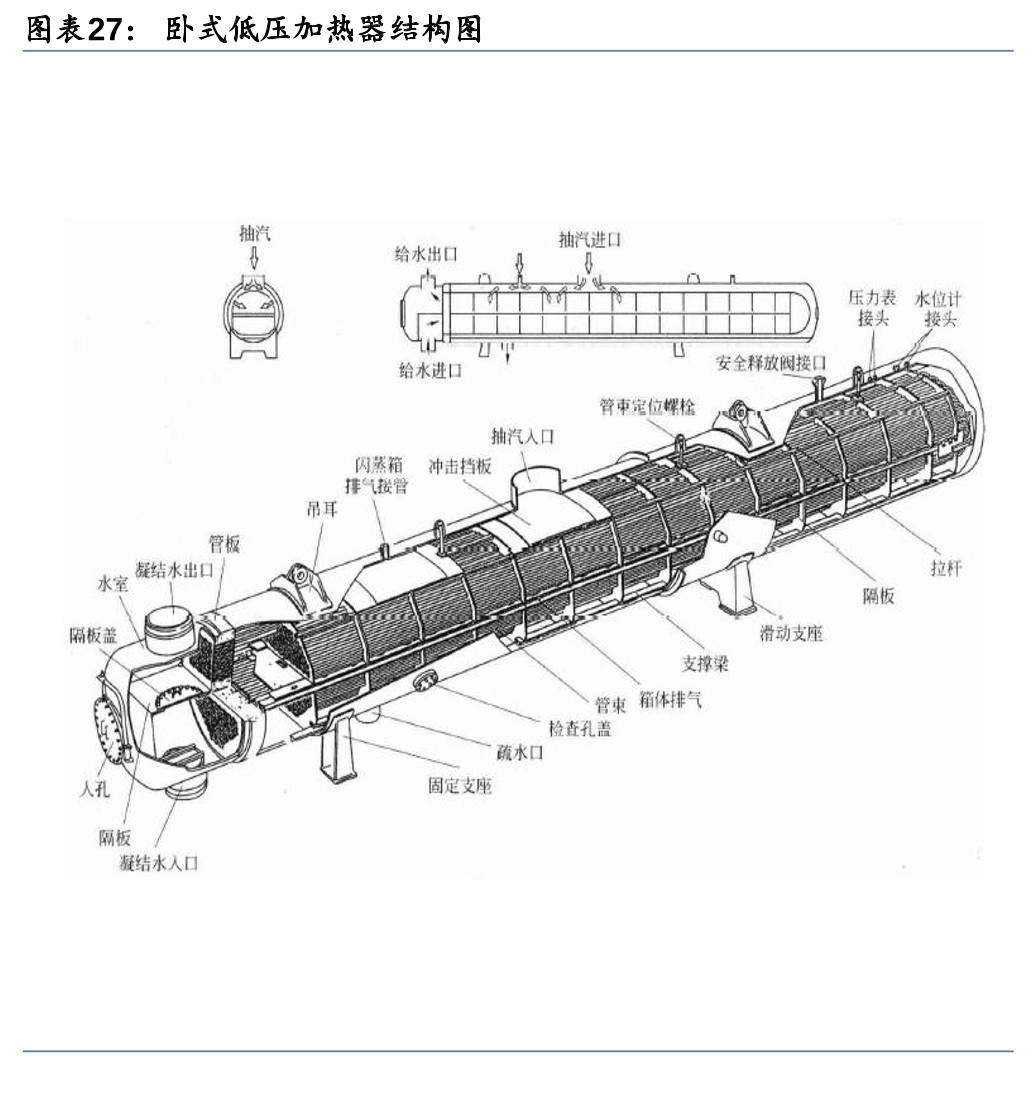 5) 給水加熱器(加熱給水和凝結(jié)水):利用汽輪機抽汽對給水和凝結(jié)水加熱,以提高熱循環(huán)的經(jīng)濟性。回?zé)峒訜崞靼雌橘|(zhì)傳熱方式的不同可分為混合式和表面式兩種。混合式加熱器為汽水直接混合傳熱;表面式則由傳熱管將加熱蒸汽和被加熱水分隔開,通過傳熱管壁實現(xiàn)熱傳遞。按表面式加熱器水的側(cè)壓力不同,位于凝結(jié)水泵和給水泵之間的加熱器屬于低壓加熱器,給水泵下游的加熱器為高壓加熱器。