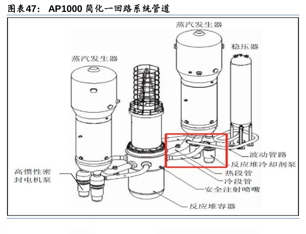 AP1000反應(yīng)堆一回路基本保留二代壓水堆設(shè)計,簡化一回路管道提高安全性和可維修性。二代壓水堆的一回路系統(tǒng)由反應(yīng)堆容器、穩(wěn)壓器、蒸汽發(fā)生器、冷卻劑循環(huán)泵以及連接管道組成,AP1000的一回路系統(tǒng)與二代壓水堆類似,不同之處在于AP1000的冷卻劑循環(huán)泵直接與蒸汽發(fā)生器相連,取消了泵與蒸汽發(fā)生器之間的管道,降低管道破裂風(fēng)險。AP1000通過簡化蒸汽發(fā)生器、泵和管道的基座和支承系統(tǒng),可減少在役檢修量和提高可維修性。
