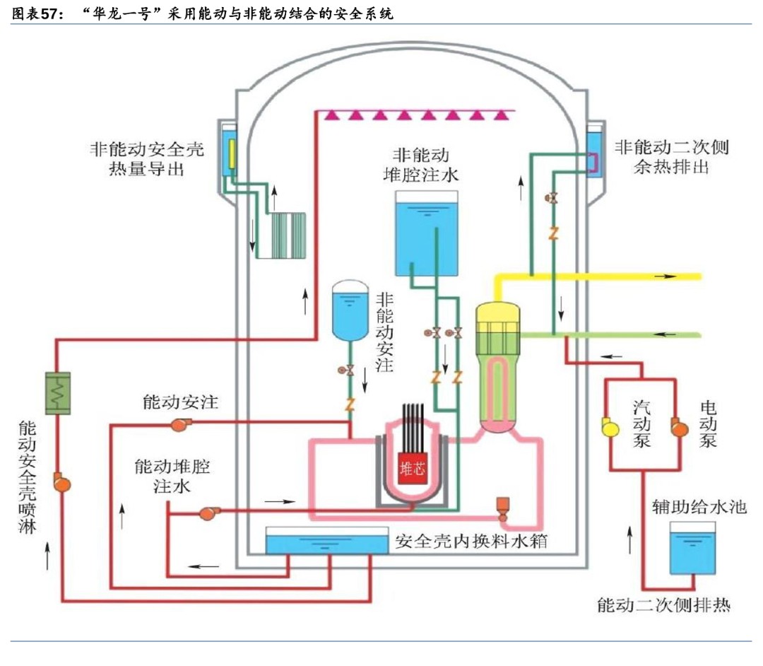 華龍一號(HPR1000):能動與非能動安全系統(tǒng)相結(jié)合,中國自主產(chǎn)權(quán)已實現(xiàn)出口驗收華龍一號采用能動與非能動相結(jié)合的安全系統(tǒng)。中國自主三代核電華龍一號已實現(xiàn)出口并通過驗收。華龍一號以能動和非能動的方式實現(xiàn)應(yīng)急堆芯冷卻、堆芯余熱導(dǎo)出、熔融物堆內(nèi)滯留和安全殼熱量排出等功能。在核島布置設(shè)計中考慮了安全系統(tǒng)和正常運行系統(tǒng)間充分的物理隔離,專設(shè)安全系統(tǒng)主要布置在兩個安全廠房內(nèi),正常運行系統(tǒng)主要布置在反應(yīng)堆廠房、電氣廠房、燃料廠房及核輔助廠房內(nèi);同時冗余的兩個安全系列分別布置在兩個安全廠房中并且由獨立的應(yīng)急柴油發(fā)電機供電。兩個安全廠房位于反應(yīng)堆廠房兩側(cè),兩個應(yīng)急柴油發(fā)電機廠房也分別布置在核島的兩個角落,實現(xiàn)了實體隔離。專設(shè)安全系統(tǒng)主要包括安全注入系統(tǒng)、輔助給水系統(tǒng)與安全殼噴淋系統(tǒng)。