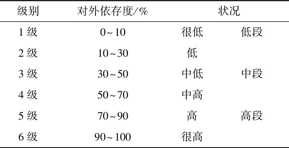 此外,學界將對外依存度從0~100%由低到高進行了6個級別劃分,以起到預警作用,見表1。對外依存度低段包括1級(0~10%)和2級(10%~30%),表示對外依賴程度低,產品供應安全;對外依存度中段包括3級(30%~50%)和4級(50%~70%),表示對外依賴程度已經進入警戒范圍,必須采取相應措施以保障產品供應安全;對外依存度高段包括5級(70%~90%)和6級(90%~100%),表示對外依賴程度高,產品供應安全風險很大。