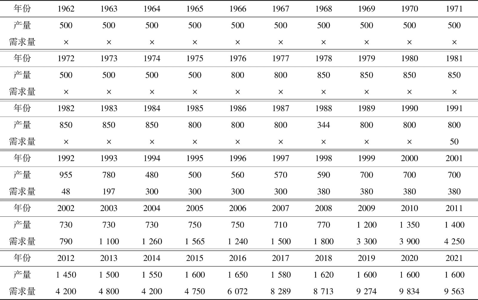 表2 1962—2021年我國鈾資源生產與需求情況 (tU)