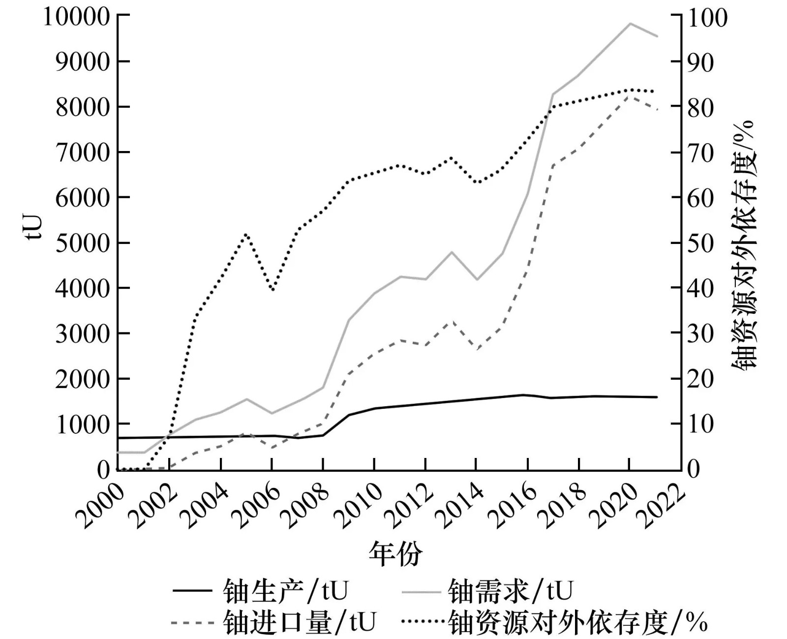 作為一種技術成熟的清潔能源,核電已經成為我國能源建設的重要選擇。為了彌補核電燃料鈾資源的國內生產量不足,我們不僅要開發利用海外鈾資源,還要確保國際貿易鈾資源供應。學術界通常采用依存度來考察一國經濟對他國經濟或對世界經濟相互依賴的程度。借鑒此概念,可以采用鈾資源對外依存度來考察我國鈾資源對國際市場的依賴程度。深入探討我國鈾資源對外依存度,不僅有利于了解我國鈾資源對外依賴程度和鈾供應安全現狀,而且有利于推進國際能源合作和提升我國鈾資源安全保障能力。21世紀,在國際節能減排和國內生態治理的雙重壓力下,中國選擇了大力發展核電等低碳能源產業。隨著我國核電事業的發展,鈾資源的需求在不斷攀升。盡管通過加大鈾資源勘探采冶力度,我國鈾生產能力得到大幅度提升,但是相對核電發展的燃料需求而言,國內鈾生產能力仍然遠遠不足。也就是說,國內鈾資源生產與需求缺口在不斷擴大,我國鈾資源對外依存度在不斷升高。