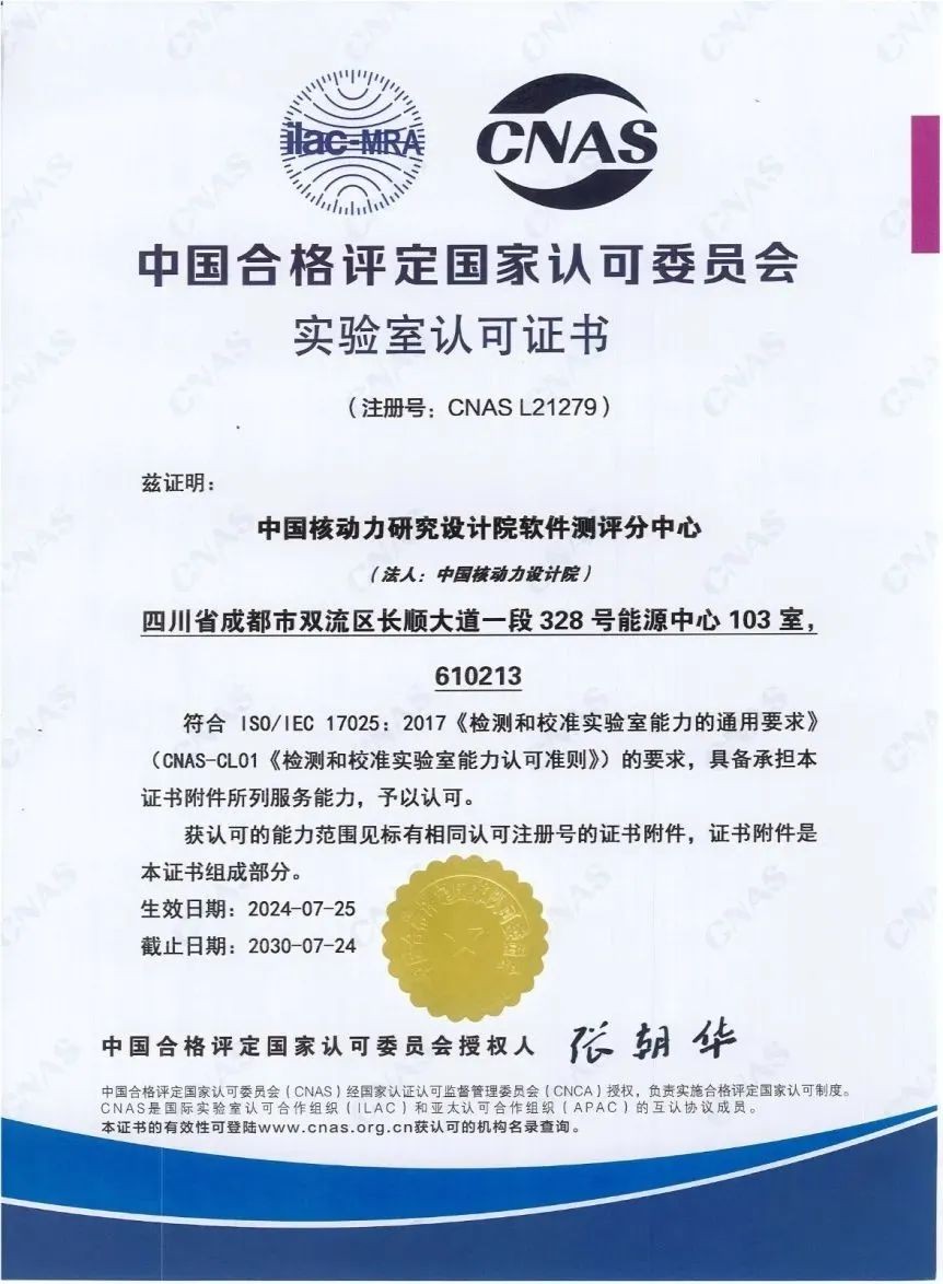 CNAS是根據《中華人民共和國認證認可條例》的規定,由國家認證認可監督管理委員會批準設立并授權的國家認可機構,統一負責對認證機構、實驗室和檢驗機構的認可工作。獲得CNAS認可,表明核動力院軟件測評分中心在硬件設施、管理水平和軟件測評能力等方面符合國家認可準則要求,可按照國家及國際認可準則開展檢測和校準的技術服務,實驗數據、檢測報告具有國內國際權威性、互認性和公信力,同時也為后期拓展外部市場注入強勁動力。