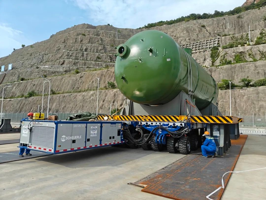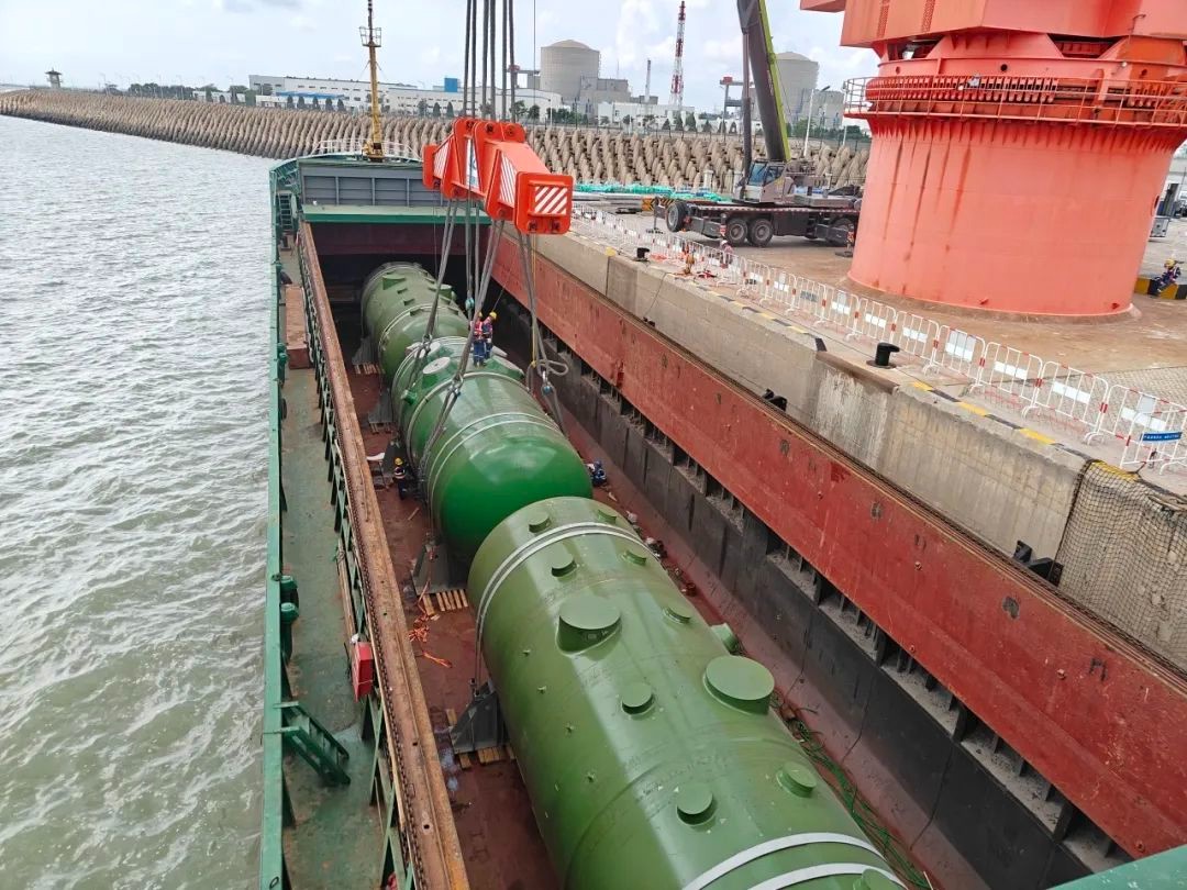 此次到貨的海運設備自6月12日從海外直航起運,遠洋航行62日到達國內營口港轉駁,通過2艘深艙船安全運抵田灣自備碼頭,包括核島核心設備蒸汽發生器2臺、壓力容器1臺、穩壓器1臺,實現7、8號機組重要設備到貨目標。