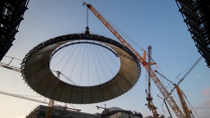 阿庫尤核電站宣布,外部安全殼穹頂的鋼制下部——直徑近 51 米,重 340 噸——現已被吊裝到 63 米高的位置,整個過程耗時 10 個小時。