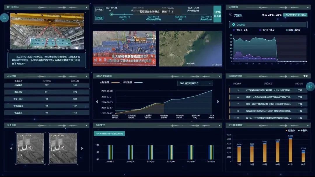 徐大堡核電作為集團公司智慧工地統建試點項目,在多方大力協同下共同建設智慧工地。智慧工地管理平臺依托現場搭建的無線網絡以及隨處可見的攝像頭和無人機,對重點區域、重點環節進行全面監控。徐大堡核電智慧工地的指揮大廳,每一位來訪者都能從智慧大屏看到不同高度、不同角度的現場航拍畫面;每一位項目管理人員都能通過指揮中心大屏和手機移動端,實時、全面地掌控現場施工情況。