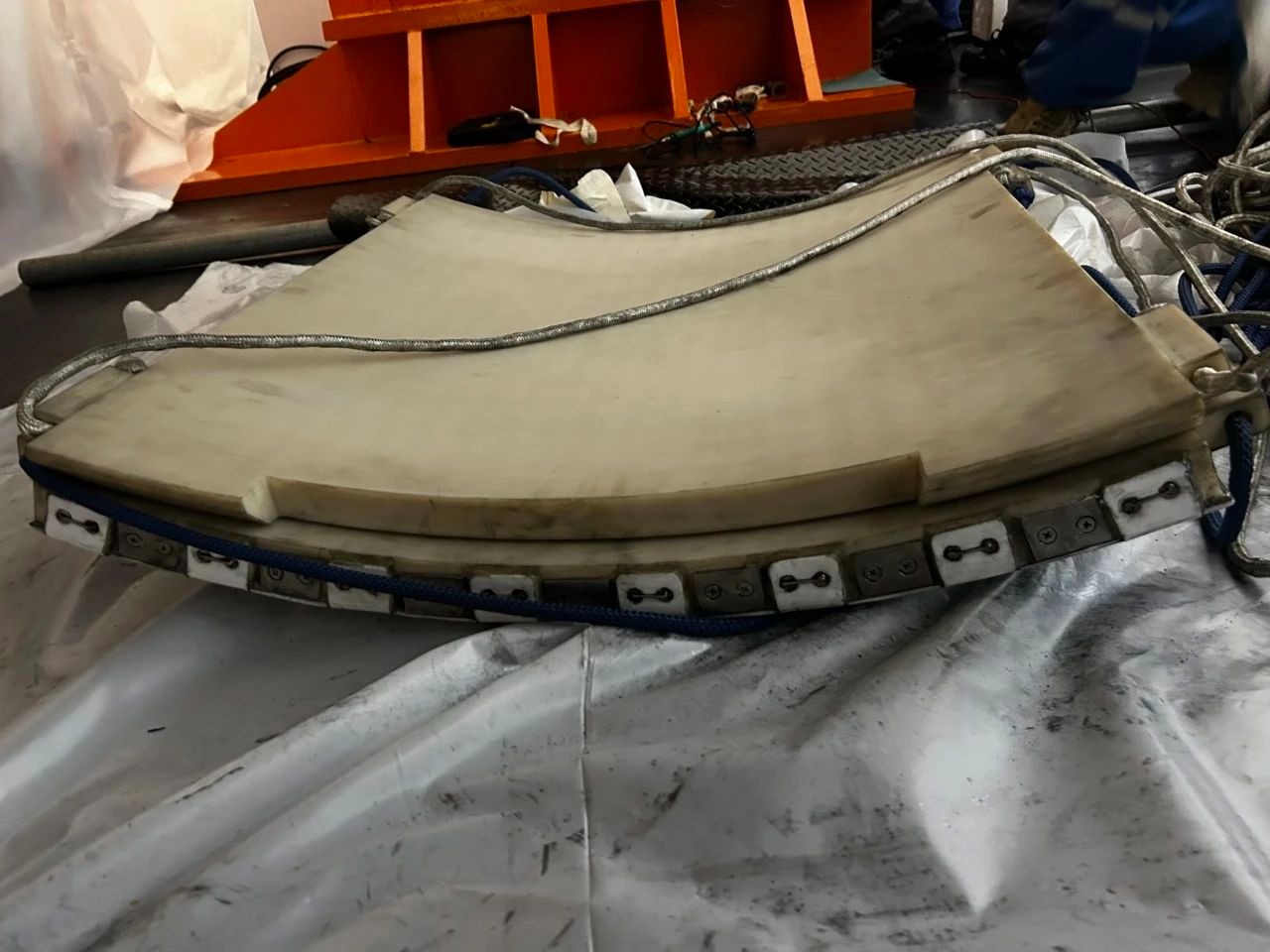 一年多來,發電機團隊圍繞技術路線的確認、評估,配套工具的設計、制造、驗收等環節,對發電機組抽轉子難點、要點、重點開展周密的研究探討,明確發電機抽轉子的每一個技術細節。經過構思、立項、研發、現場使用,在實現單行車抽穿轉子的征途中,發電機項目組成功研制出新型滑塊,并獲得專利。不同于傳統滑塊,新型滑塊是雙層結構,包括下層滑塊和上層滑塊。使用過程中,單層滑塊依次通過發電機定轉子間隙,對定轉子間隙要求更低。上下層滑塊通過凹槽和凸部配合,從根本上消除了滑塊錯位的風險。最終使用新型滑塊,形成完善的單行車抽穿轉子方案。