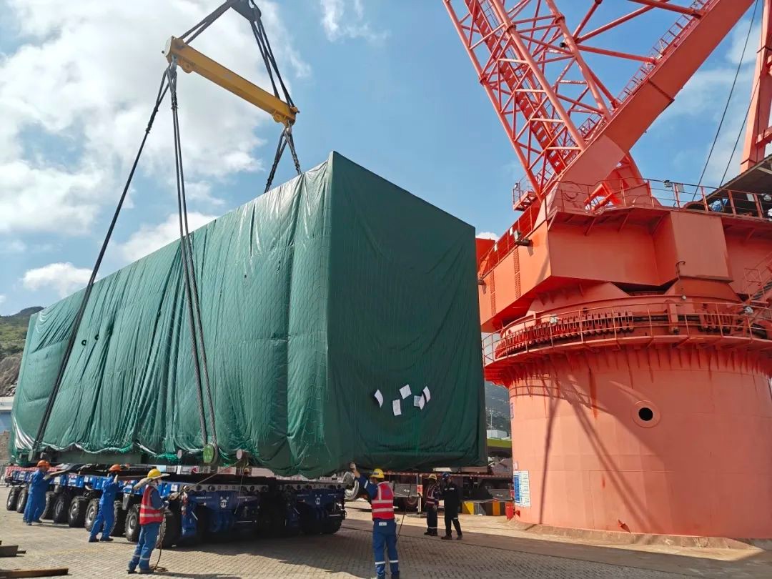 8號機組凝汽器殼體模塊共計6臺,本次到貨其中2臺,單臺設備長19.84米、寬5.80米、高6.30米,重240噸,自8月24日從上海臨港碼頭裝船發運,歷時4天安全抵達田灣核電自備碼頭。為保障主設備順利進場,項目設備部黨員、干部率先垂范、沖鋒在前,提前策劃、精心部署,從作業方案審查、運輸路勘整改、設備裝船發運、碼頭卸船吊裝、場內短倒運輸,每個環節都嚴格把控,確保各作業環節安全可控,在各參建單位的通力協作和高效配合下,順利完成了主設備一次引入。