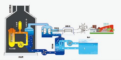 在榮成的國家電投新能源科技館,一個1∶60的模型清晰展示了“國和一號”的構造。核電機組整體上可分為兩大部分:一側是核島,有高聳直立的核反應堆壓力容器和蒸汽發生器,鋼穹頂上方放著一個巨大水箱;另一側為常規島,核島產生的蒸汽傳送過來驅動汽輪機發電。