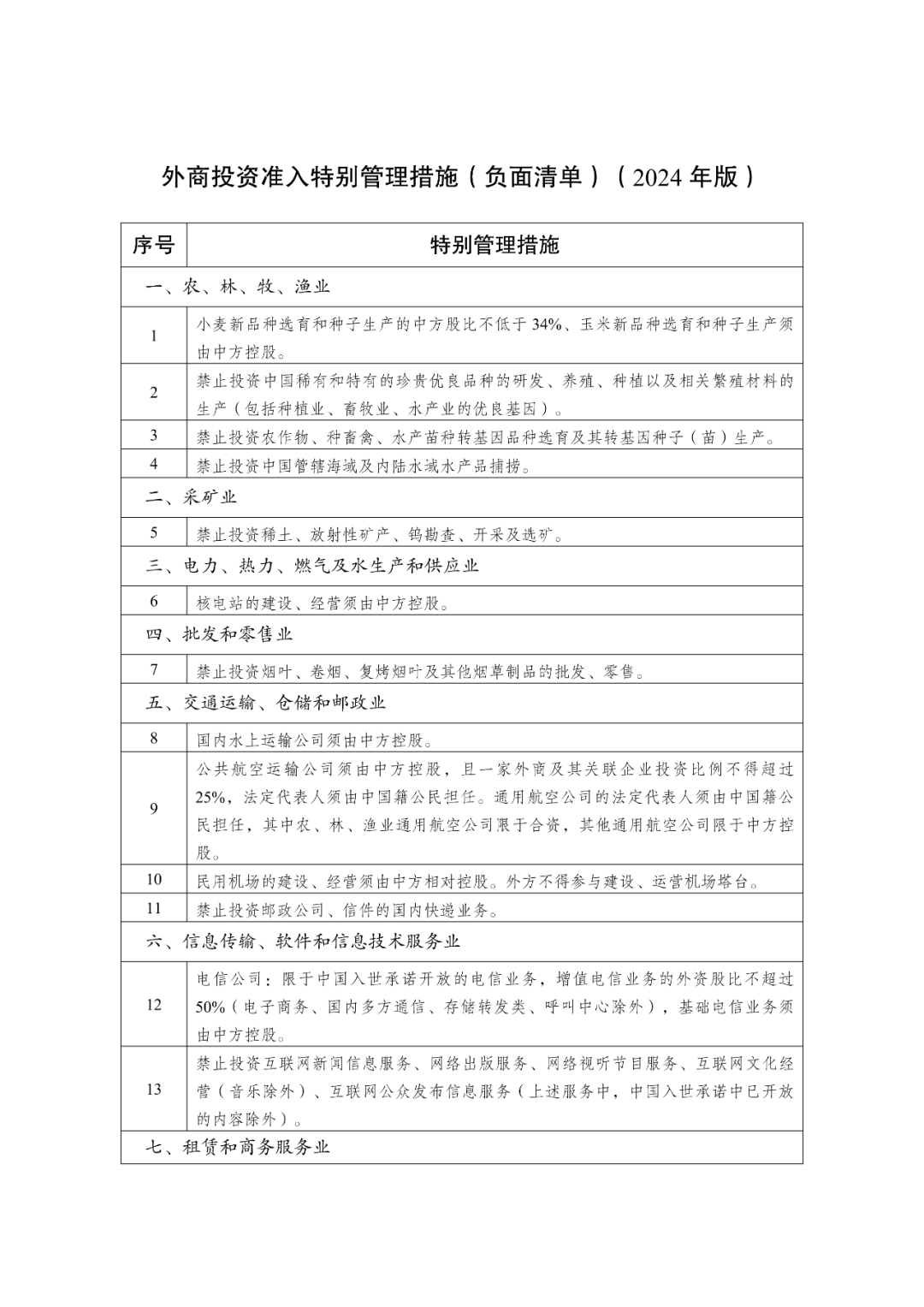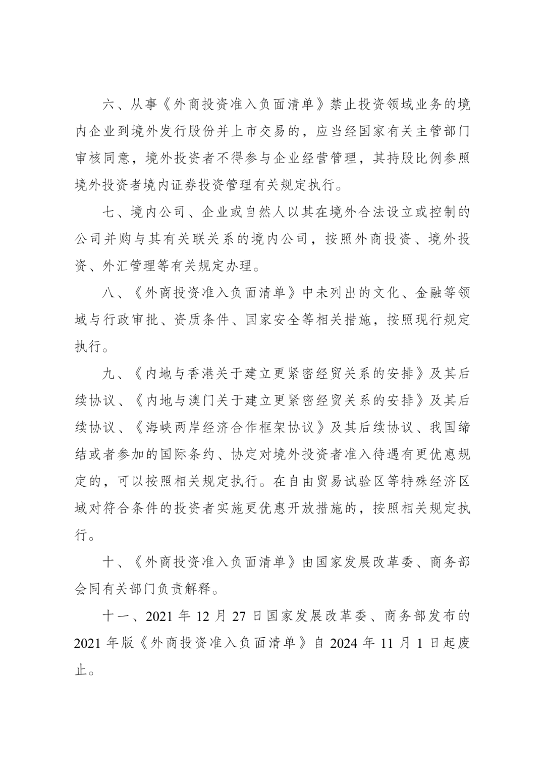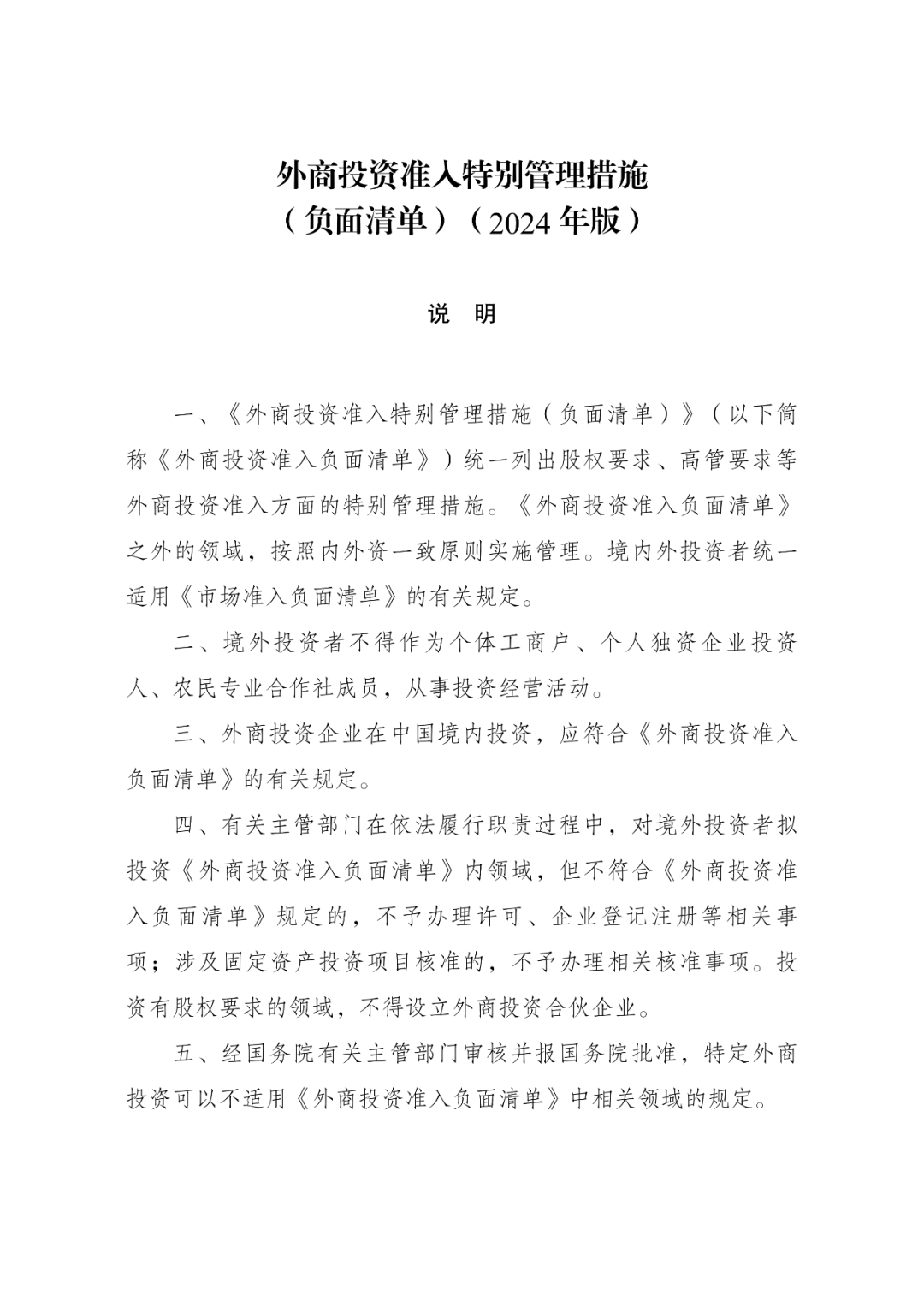 《外商投資準入特別管理措施(負面清單)(2024年版)》已經2024年4月8日國家發展和改革委員會第10次委務會議審議通過和商務部審簽,并經黨中央、國務院同意,現予發布,自2024年11月1日起施行。