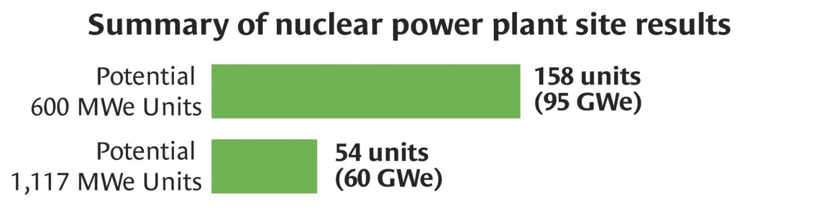 大型和小型反應堆:根據初步分析,有 41 座運行或退役核電站能夠容納至少一座新的大型輕水反應堆,例如西屋 AP1000 反應堆,該反應堆最近在美國佐治亞州的沃格特爾 3 號和 4 號機組中使用。報告詳細說明,還有可能再增加 54 臺 1,117 兆瓦機組,這將使美國核電容量增加 60 吉瓦。如果在其他地點增加 158 臺小型先進反應堆(例如 600 兆瓦機組),核電容量可以進一步增加到 95 吉瓦。