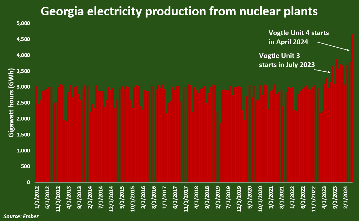 Ember 的數(shù)據(jù)顯示,前兩臺反應(yīng)堆于 20 世紀 80 年代末投入生產(chǎn),2012 年至 2022 年間將產(chǎn)生佐治亞州約 27% 的電力。