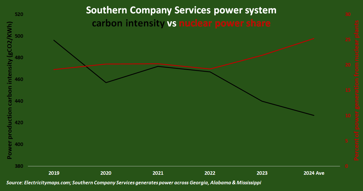 佐治亞州核能發(fā)電量的增加反過來又幫助削減了南方服務(wù)電力系統(tǒng)的發(fā)電碳強度,該系統(tǒng)為佐治亞州、阿拉巴馬州和密西西比州部分地區(qū)提供電力。