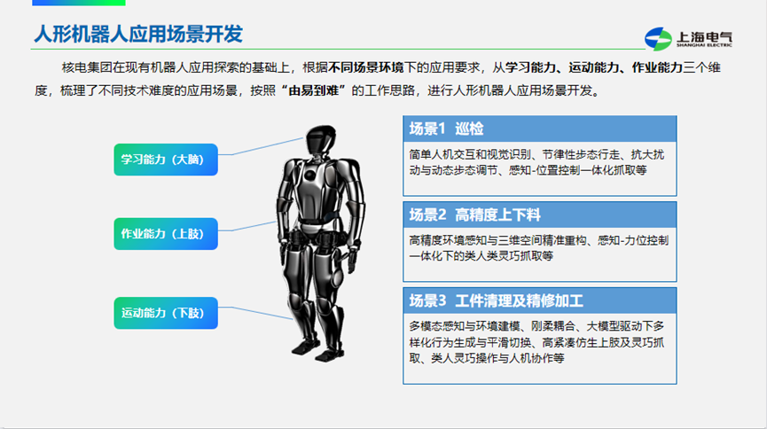 隨著技術(shù)的不斷進(jìn)步,人形機(jī)器人正逐步從實(shí)驗(yàn)室走向工業(yè)現(xiàn)場(chǎng)。李華綱認(rèn)為,人形機(jī)器人具有學(xué)習(xí)能力、運(yùn)動(dòng)能力和作業(yè)能力等方面的優(yōu)勢(shì),有望在核電裝備制造中發(fā)揮重要作用。李華綱表示,上海電氣核電集團(tuán)已經(jīng)與國家地方共建人形機(jī)器人創(chuàng)新中心展開合作,正計(jì)劃從易到難、從局部到整體,集雙方之所長,逐步推進(jìn)人形機(jī)器人在巡檢、高精度上下料、工件清理及精密加工等場(chǎng)景的應(yīng)用。