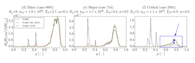 氘的加熱曲線顯示在 (d) 次要、(e) 主要和 (f) 嚴重異常值案例中。黑色表示原始數(shù)字代碼與異常值特征(峰值)一起顯示。紅色顯示 AI 模型的預(yù)測。綠色顯示更正后代碼的預(yù)測,AI 模型預(yù)料到這些預(yù)測,甚至預(yù)測更高的加熱。(圖片來源:Álvaro Sánchez-Villar / PPPL)