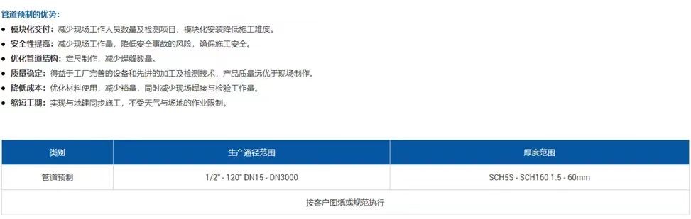 我們可以提供從口徑DN15(1/2") 到 DN3000(120"),壁厚等級SCH5S到SCH160的管道預制,且材質涵蓋各種等級:碳鋼,不銹鋼,雙相不銹鋼/超級雙相鋼,鎳基合金,鈦合金等。產品廣泛應用于國內外石油、石化、船舶、冶金、電力、核能、食品、制藥、機械等行業。生產標準可按照GB、HG、SH、SY、DL、ISO、ANSI/ASME、MSS、JIS、EN、AS等相關標準要求生產,也可按照客戶來圖提供定制化生產,以滿足不同行業及不同設計的需要。