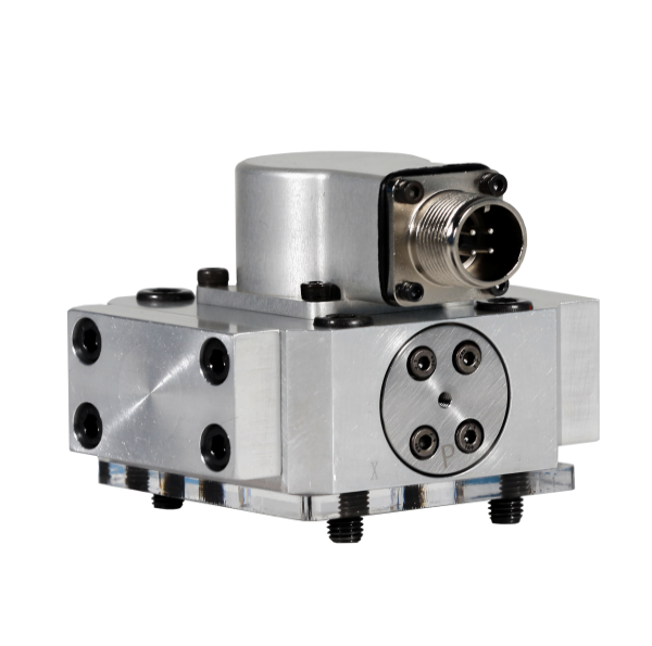 當力矩馬達線圈輸入控制電流時,線圈在銜鐵上產生一個磁力矩,使銜鐵組件繞彈簧管中心旋轉,從而使擋板向一側偏移,導致一邊噴嘴擋板距離減小,另一邊噴嘴擋板距離增大,產生控制壓力推動閥芯運動。同時,反饋桿發生彈性變形,產生反饋力矩,當與作用在銜鐵組件上的磁力矩達到平衡時,閥芯停止運動,保持在一個平衡位置。