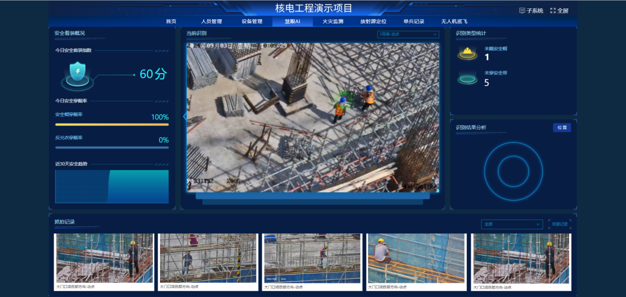 基于超星光全光譜AR全景球和小茗高點巡檢AI服務器,加載人員數量識別、機械類型數量識別、各類高墜隱患識別、進度工序識別等AI視覺算法,實現全景自動巡檢、功效自動分析、隱患自動識別和進度自動追蹤。除了常規的安全帽、反光衣識別外,針對安全殼穹頂、變電站、發電機廠房等位置,重點部署安全帶掛鉤和周界安防算法,防止安全事故發生。
