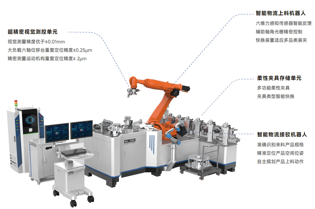【主要特點】: *微米級運動精度和視覺測量精度實現超精密智能裝配。 *作業過程實時鏡像展示,“虛實結合”、“直觀”、“便捷”。 *視覺智能實現工件“認的準”、“抓的準”、“裝的準”。
