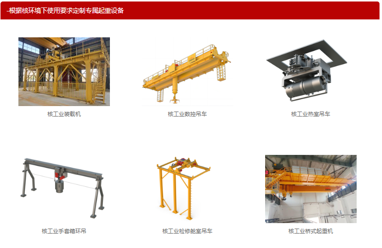 【產品類別】:核工業裝載機、核工業數控吊車、核工業熱室吊車、核工業手套箱環吊、核工業檢修艙室吊車、核工業橋式起重機等