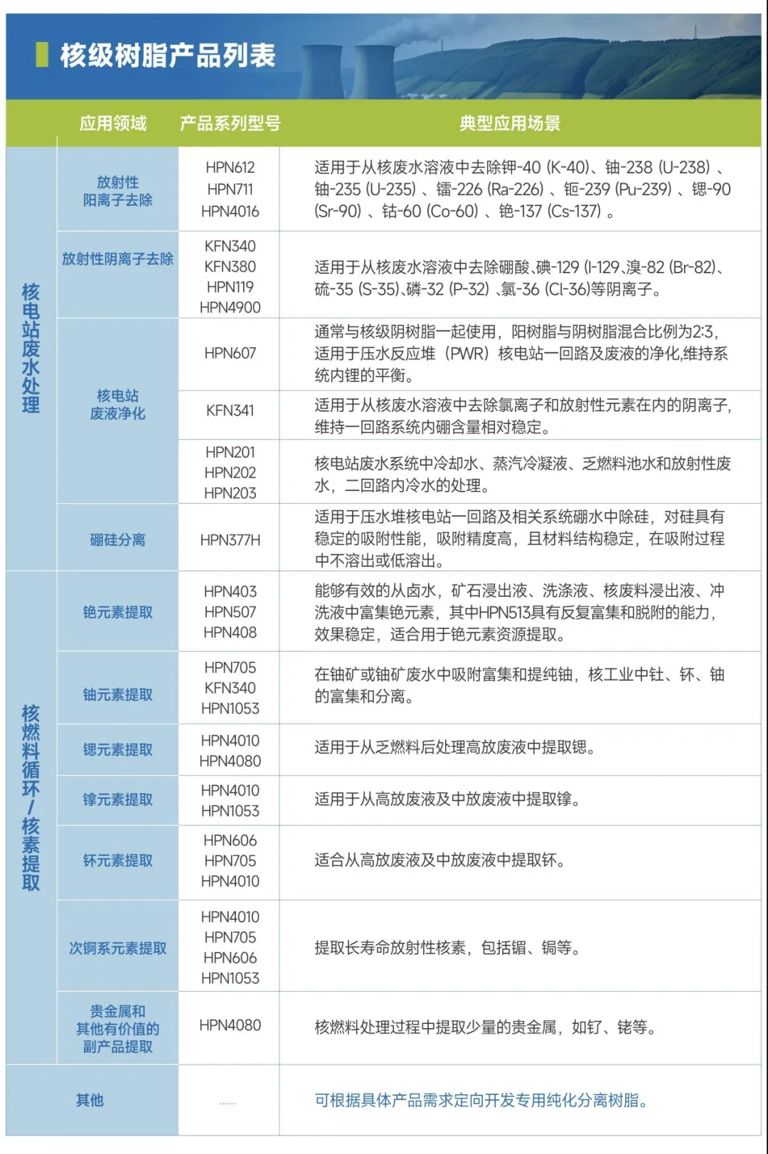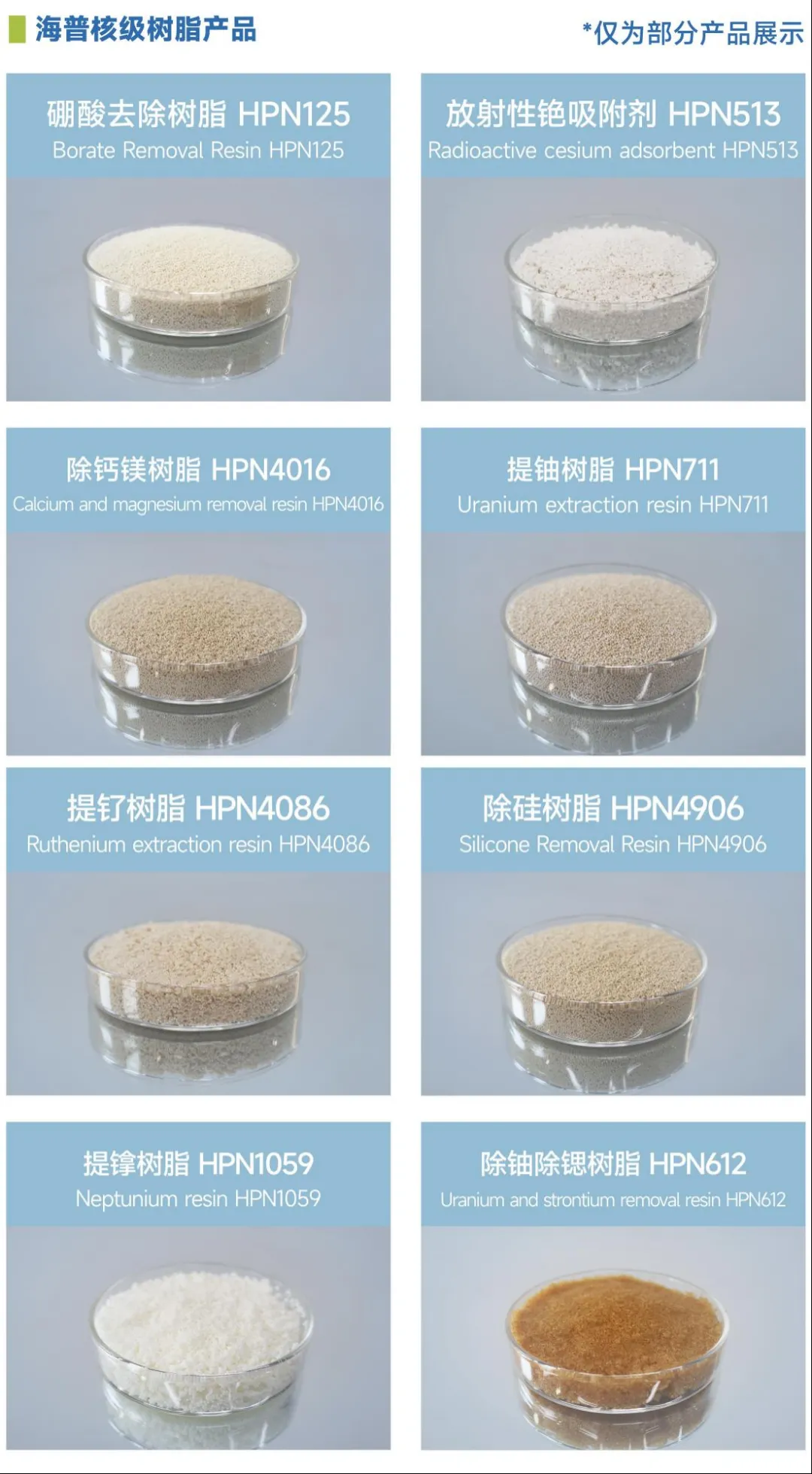 核工業在發展過程中會產生大量的放射性廢液,這些廢液的安全處理對于保障核能的綠色和可持續發展至關重要。為了有效凈化反應堆冷卻劑、乏燃料池冷卻水、蒸汽發生器排污水以及放射性廢水排放等系統,選用的核級樹脂應具備交換容量大、出水標準高和穩定性好等特點,以減少放射性廢物的產生。針對核廢液的無害化處置,海普成功開發出高容量、高穩定性的特種吸附材料,適用于各類低、中、高放射性廢液無害化處置,服務于核工業安全綠色發展。