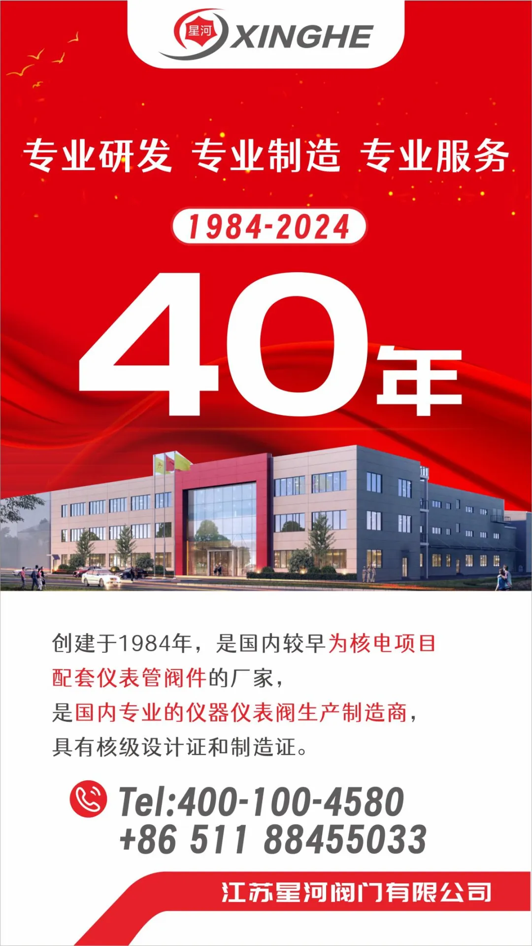 江蘇星河閥門有限公司創建于1984年,是國內最早為核電項目配套儀表管閥件的廠家。公司于1999年即首次取得了民用核承壓設備制造許可證,并延續至今公司成立三十年來,一真專注并深耕于儀表管閥件行業,通過不斷的技術創新,可靠的產品質量以及持續滿足顧客要求的能力,使得產品在核電、石油、化工、天然氣、機車、氫能源、半導體等行業中得到廣泛應用,贏得了優質的市場口碑。