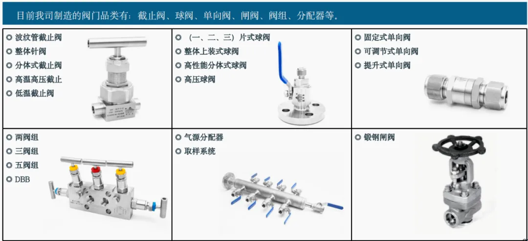 公司緊貼市場發展,用心傾聽用戶的需求,以滿足市場需求作為創新導向同時,我司在核電、氫能、石化等領域,不斷與設計院、科研院校、業主進行深層次共同聯合研發,推動儀表管閥件國產化,著力解決國家重大建議項目因貿易戰,推遲項目周期的問題。我們的四大系列產品:閥門及閥組、管件、防爆電氣及接地件、橋架制造(1)儀表閥門是儀控測量系統中重要的控制部件,具有截止、調節、導流、防止逆流、穩壓、分流等功能。儀表閥門質量的穩定對整個儀控系統測量數據的準確性及安全性有著至關重要的作用。