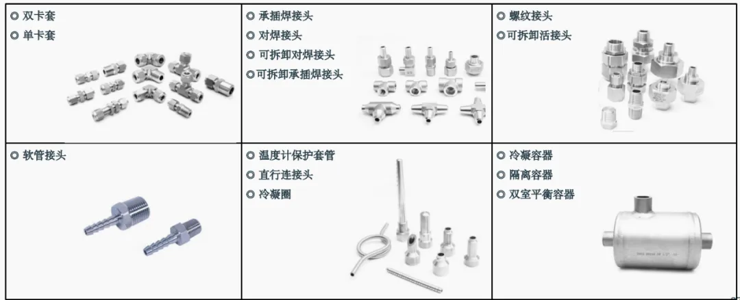 (2)目前我司制造的管件品類有:卡套接頭、焊接接頭、螺紋接頭、軟管接頭、溫度計保護套管、輔助容器等。