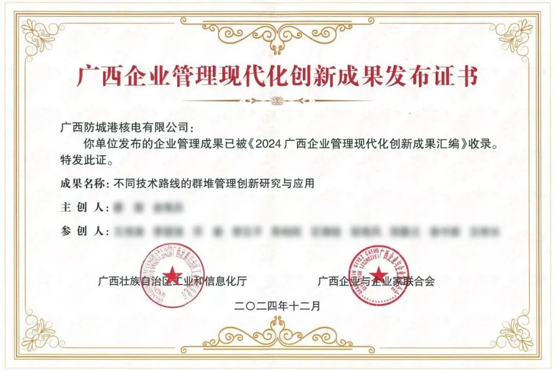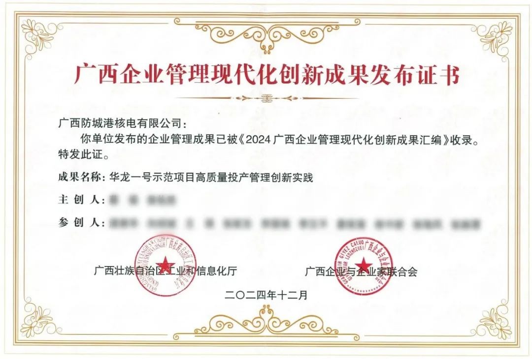 12月11日,廣西企業與企業家聯合會在南寧市舉辦2024年廣西企業管理創新現場交流活動,活動公布了2024年度廣西企業管理現代化創新成果的評審結果,防城港核電《華龍一號示范項目高質量投產管理創新實踐》和《不同技術路線的群堆管理創新研究與應用》被評為2024年度廣西企業管理現代化創新成果。