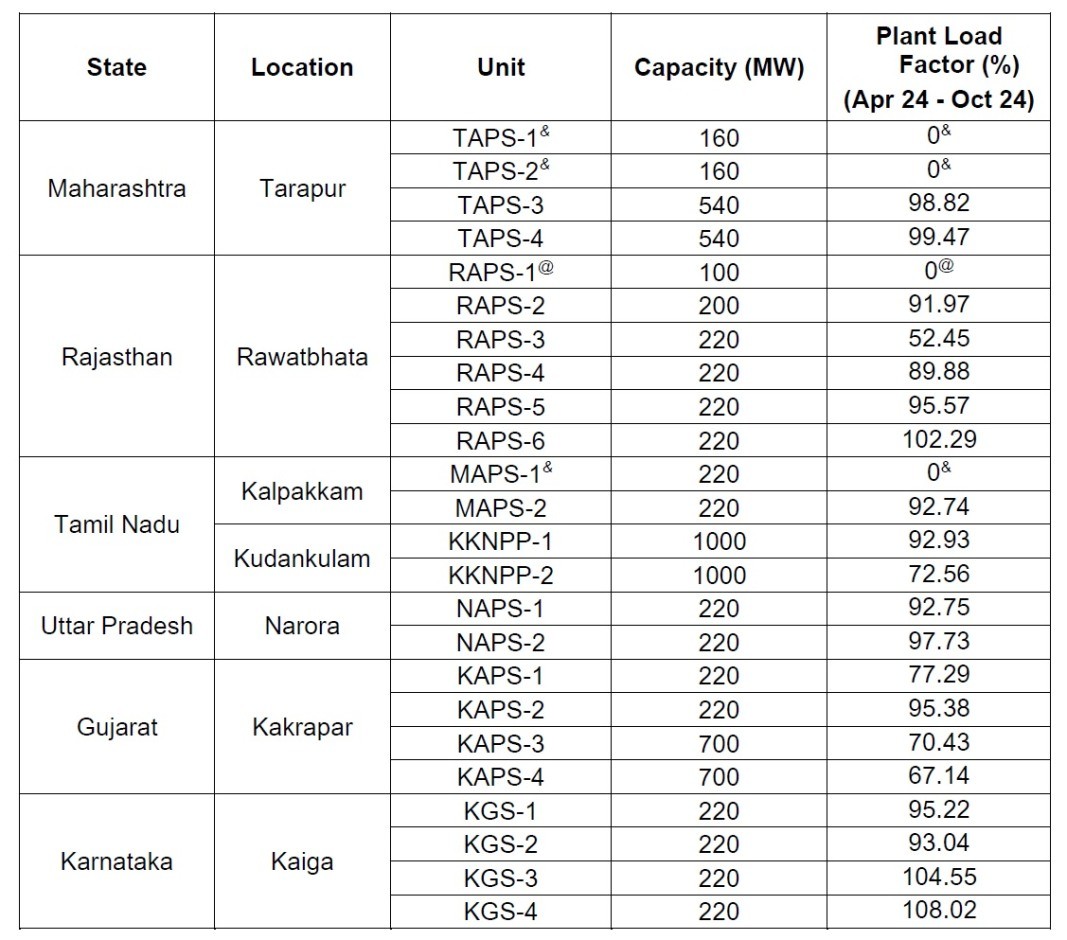 該官員總結了2024年4月至10月期間印度核電站現有發電機組的表現。