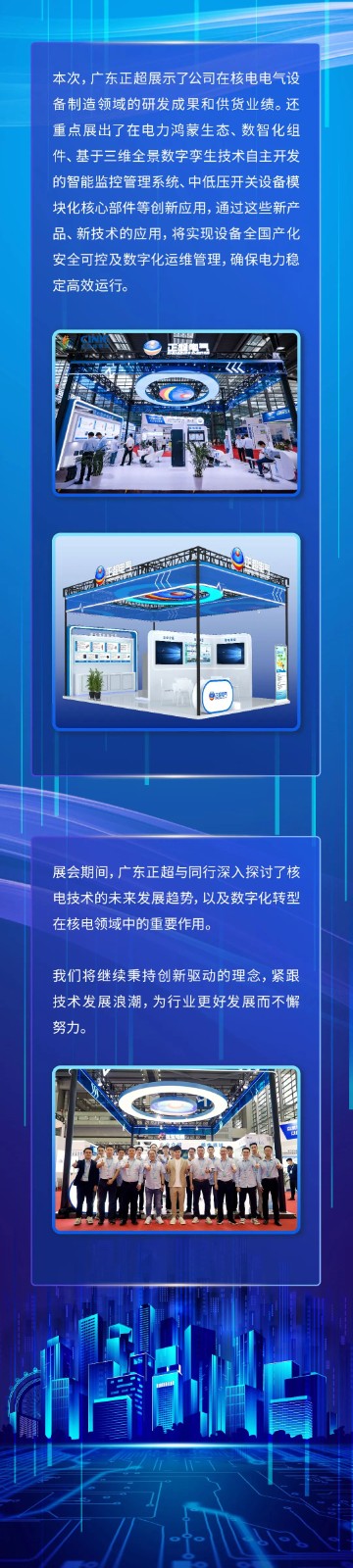 本次,廣東正超展示了公司在核電電氣設備制造領域的研發成果和供貨業績。還重點展出了在電力鴻蒙生態、數智化組件、基于三維全景數字孿生技術自主開發的智能監控管理系統、中低壓開關設備模塊化核心部件等創新應用,通過這些新產品、新技術的應用,將實現設備全國產化安全可控及數字化運維管理,確保電力穩定高效運行。
