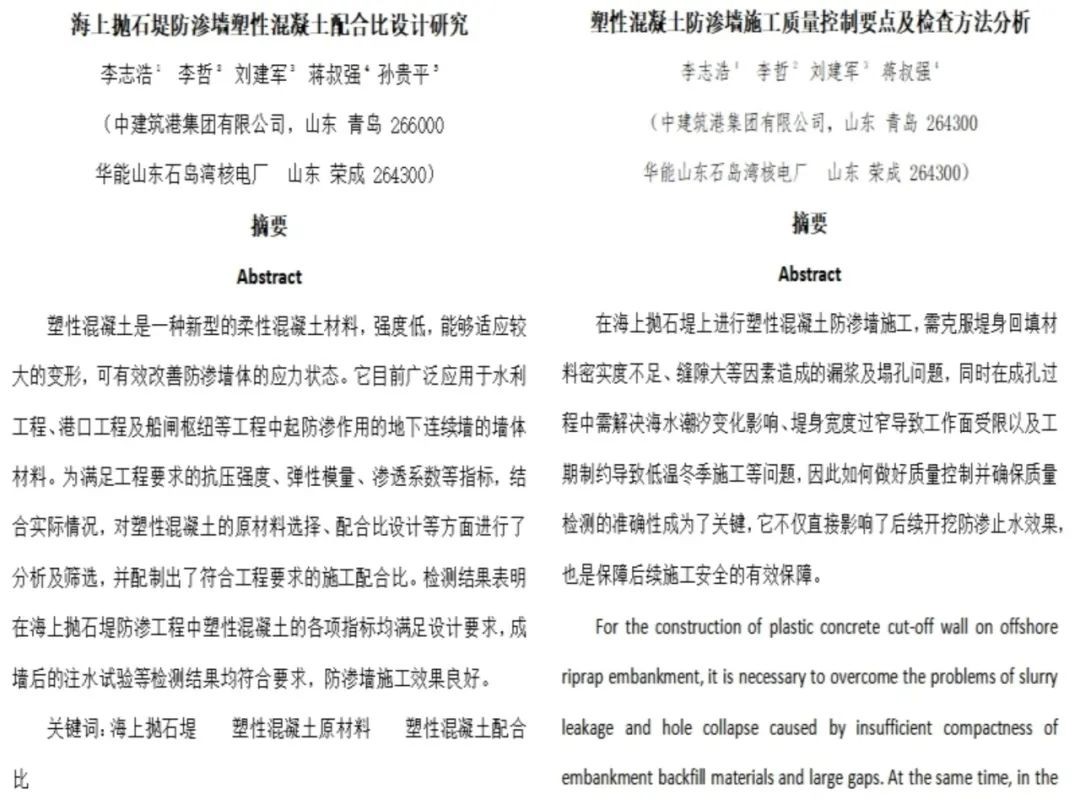 項(xiàng)目建設(shè)過程中,中建筑港建設(shè)者始終以科技創(chuàng)新促生產(chǎn),先后研發(fā)實(shí)用專利7項(xiàng),完成《海況拋石護(hù)岸塑性混凝土防滲墻施工技術(shù)研究》科研課題1項(xiàng);省級(jí)QC成果《提升混凝表面防腐硅烷浸漬深度》1項(xiàng);在省部級(jí)以上刊物發(fā)表論文《塑性混凝土防滲墻在核電工程中的應(yīng)用》《海上拋石堤防滲墻塑性混凝土配合比設(shè)計(jì)研究》兩篇次。