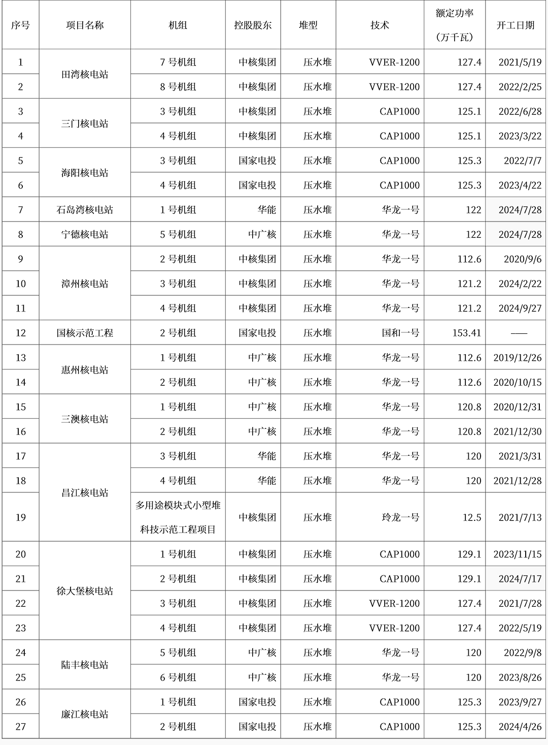 表2:我國大陸在建核電機組情況(截至2024年12月31日)
