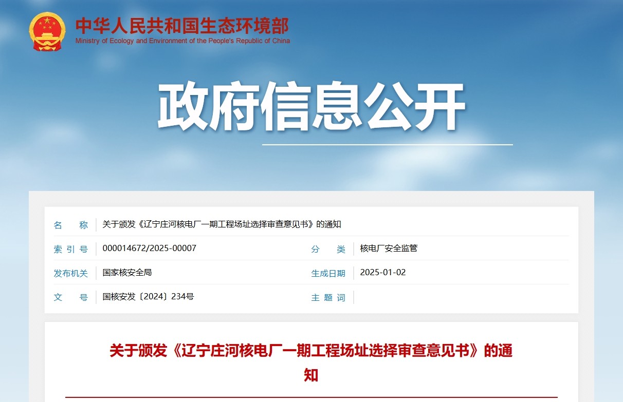 根據《中華人民共和國核安全法》及相關核安全法規,我局對你公司提交的《遼寧莊河核電廠一期工程選址安全分析報告(C版)》及相關文件進行了核安全技術審查,未發現場址存在影響遼寧莊河核電廠一期工程安全且不能采取工程措施解決的顛覆性因素。我局決定向你公司頒發《遼寧莊河核電廠一期工程場址選擇審查意見書》(國核安證字第2429號,見附件)。