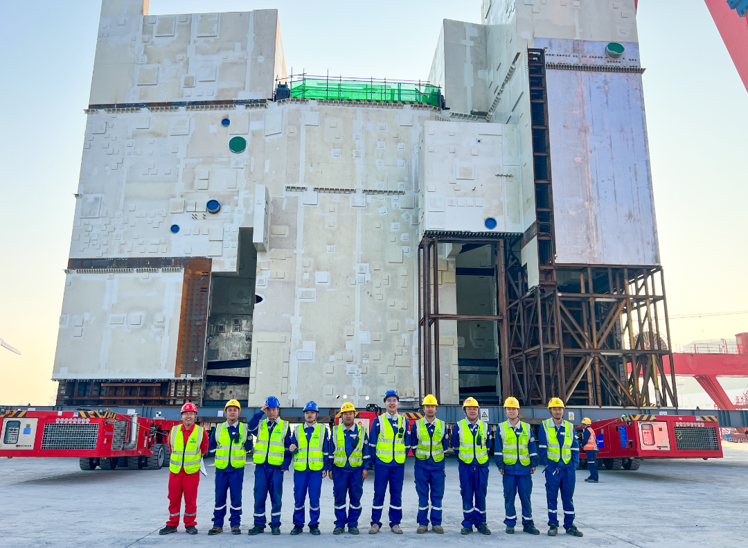 CA01結(jié)構(gòu)模塊尺寸龐大,長約29米,寬約26米,高約23米,由47個子模塊組裝而成,運(yùn)輸重量近1100噸。為確保運(yùn)輸過程的平穩(wěn)與安全,項(xiàng)目部采用三組SPMT車,通過精心設(shè)計12根型鋼,建立起三組車輛與托架平臺之間的剛性連接,從而提高了車輛的同步性。由于設(shè)備重心偏移,頂升后托架平臺與車板會出現(xiàn)翹起現(xiàn)象,項(xiàng)目團(tuán)隊通過增加配重多次調(diào)整壓力,確保了運(yùn)輸過程中車輛前后左右的水平度誤差不超過50毫米,體現(xiàn)了極高的運(yùn)輸難度和精湛的技術(shù)水平。
