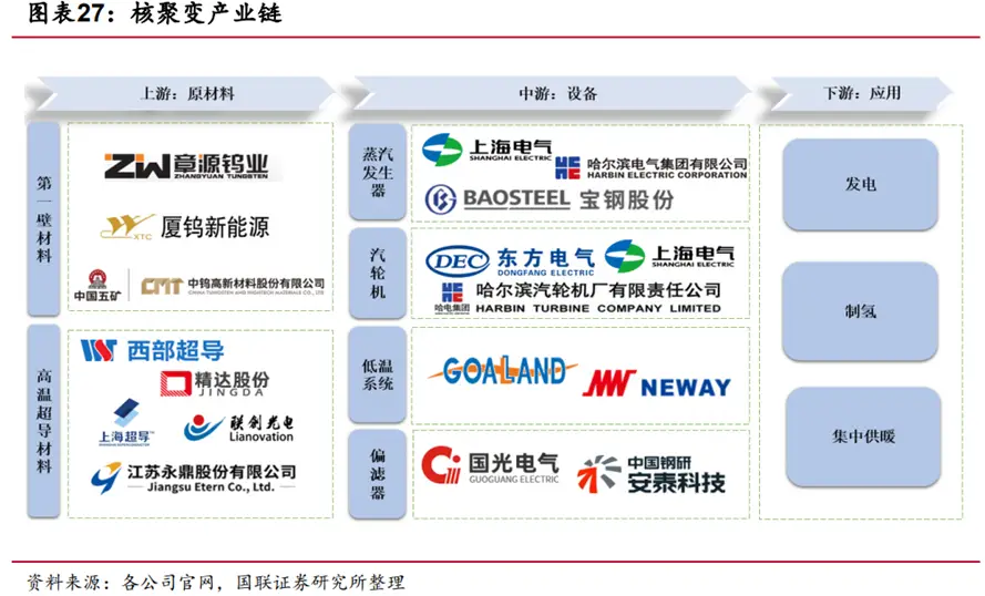 首先,核聚變發電的經濟效益不言而喻。與傳統的化石燃料相比,核聚變反應釋放的能量更為巨大,且原料豐富,成本相對較低。一旦實現了商業化運行,將大幅降低電力成本,從而減少工商業生產和居民生活的能源支出,提高整個社會的能源使用效率。同時核聚變發電站的建設和運營也將帶動相關產業鏈的發展,以下是來源于國聯證券研究所整理的部分上下游產業的相關公司,這些企業為社會創造大量就業機會,促進了國民經濟的增長。