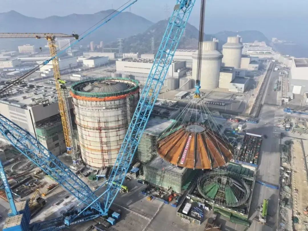 1月22日,三門核電3號(hào)機(jī)組屏蔽廠房鋼穹頂?shù)跹b就位,為屏蔽廠房穹頂結(jié)構(gòu)完工里程碑節(jié)點(diǎn)實(shí)現(xiàn)奠定了基礎(chǔ)。鋼穹頂由上口環(huán)梁、徑向梁、屋面板等構(gòu)件組成,整體呈圓錐臺(tái)形,直徑約40米,高度約10米,位于屏蔽廠房頂部,吊裝總重超過1000噸。