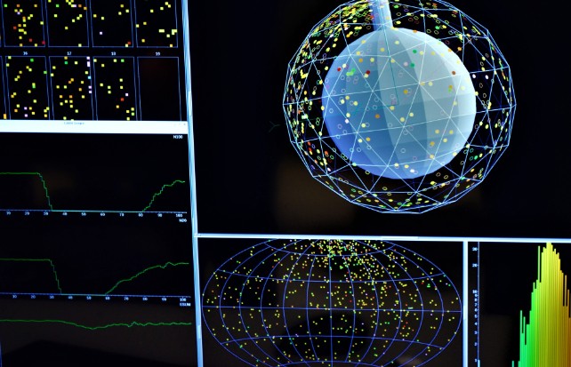 Sno+ 在一大罐液態烷基苯中檢測到切倫科夫輻射閃光。(Sno+ 合作)