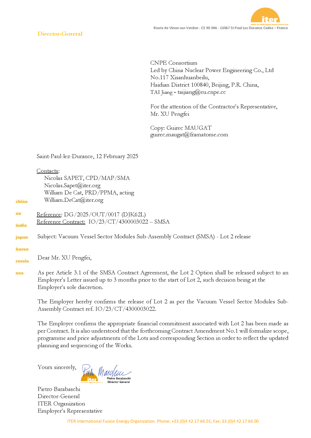 2025年2月13日,國際核聚變組織(IO)向CNPE聯合體發送正式函件批準SMSA合同LOT 2釋放,標志著SMSA項目合同進入一個新的里程碑。