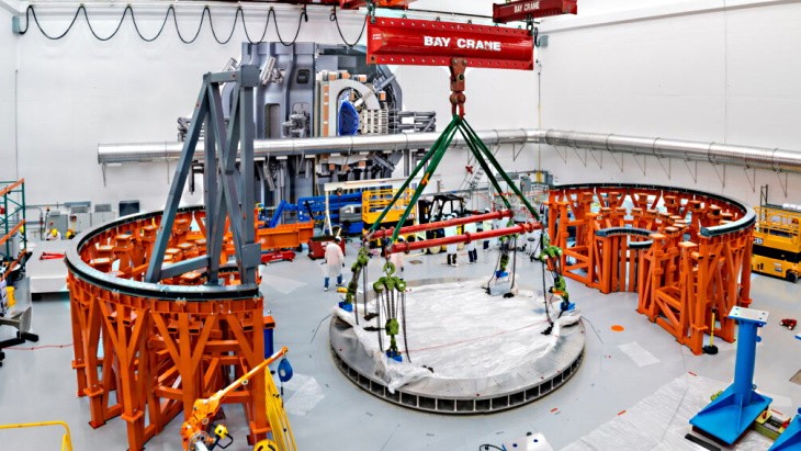 在接下來的幾個月里,CFS 將在兩個橙色支架上安裝 D 形環向場 (TF) 磁鐵,將 SPARC 的真空容器插入這些 TF 磁鐵的內部,添加環繞結構的圓形極向場 (PF) 磁鐵,將圓柱形中央螺線管 (CS) 磁鐵放到托卡馬克的中心,并用低溫恒溫器的側面和頂部密封整個組件。