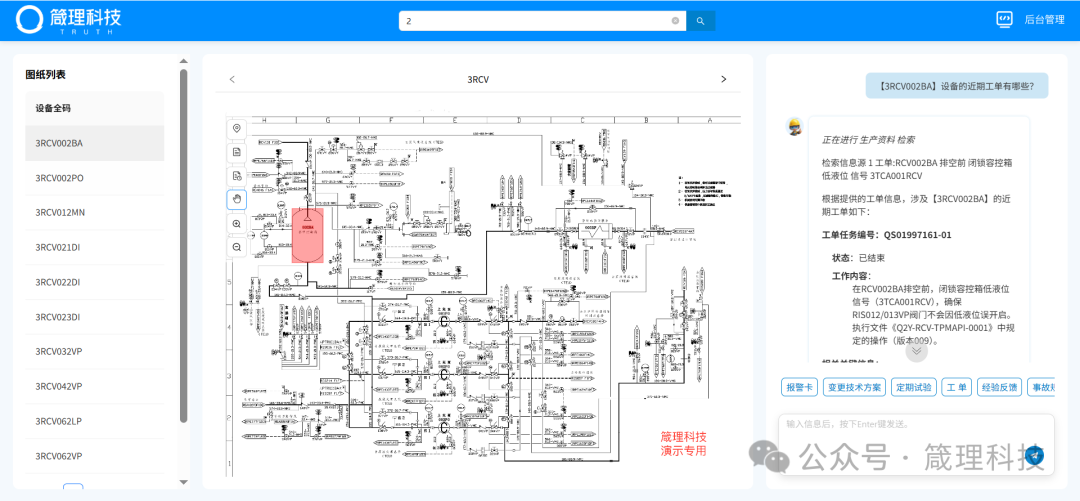 該平臺集成圖紙數據存儲、智能檢索、內容高亮指引和跨系統問答于一體,同時連接設備中臺、系統手冊、定期試驗、工單系統、技術報告等多源數據庫,實現圖紙與工業知識的智能交互,徹底消除數據孤島。