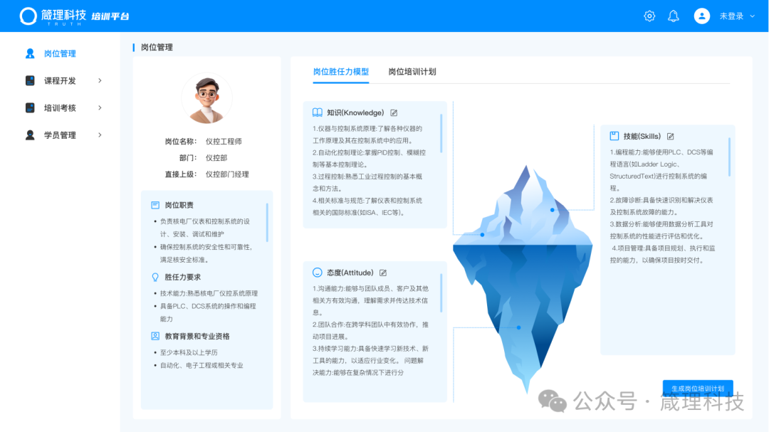 基于崗位職責和崗位任務,生成崗位勝任力模型 模型可視化展示,從崗位勝任力模型生成崗位培訓大綱,根據培訓前測試 精準識別知識薄弱點,開發學習地圖 因材施教地開展培訓。