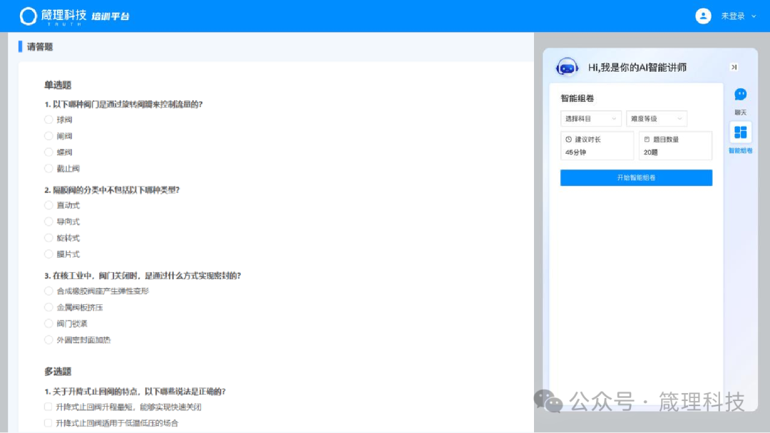 根據教員輸入信息一鍵生成,專業PPT、教材、授課視頻,根據崗位勝任力模型KSA創建多種題型習題庫,覆蓋核心知識點。