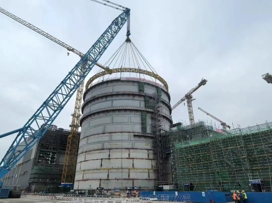 本次吊裝的SC13-14層模塊充分秉承“應模盡模”理念,進一步提升了屏蔽廠房建造效率。該模塊由兩層24個子模塊拼裝而成,整體呈圓筒型,外徑約40米,高約7米,吊裝重量超過600噸。相比3號機組的單圈工藝,4號機組SC13-14層采用雙圈拼裝、吊裝工藝,模塊化程度更高,可減少一次SC模塊整體運輸、吊裝,減少一圈SC現場安裝環焊縫,進一步提升了高空作業的安全。
