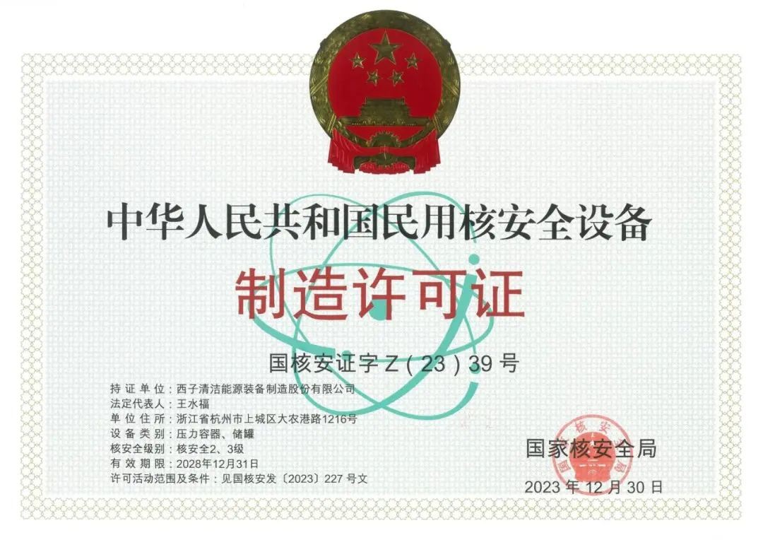技術的沉淀終成跨越的底氣。自2011 年國家核安全局受理取證申請起,公司歷經 8 年審核 —— 從文件澄清、模擬件制作到現場審核,全公司協同攻堅,于2018年成功獲頒“民用核安全設備制造許可證(核2、3級壓力容器、儲罐、熱交換器)”,成為當時浙江省唯一獲此資質的大型上市企業。這張國家特別許可頒發的證書,不僅是對公司管理水平與制造實力的認可,更讓西子潔能正式叩開核島設備制造的大門。